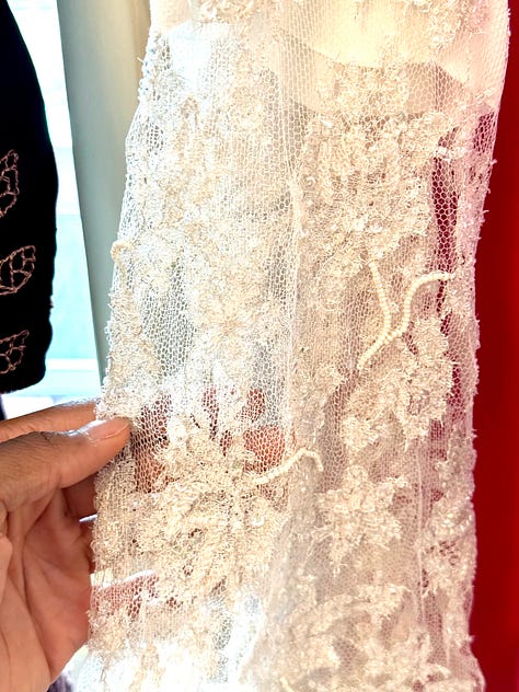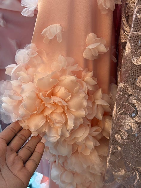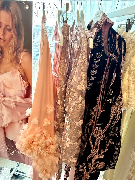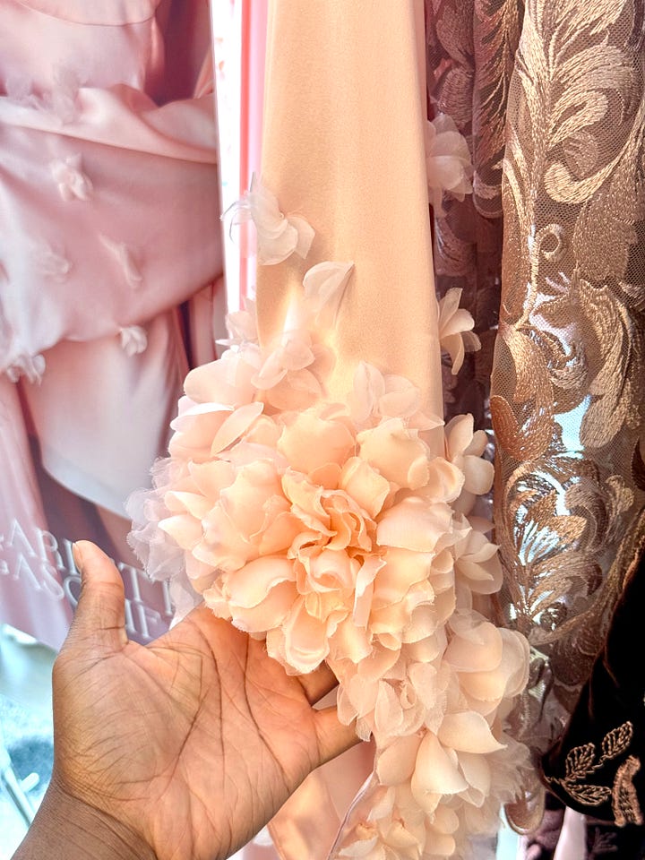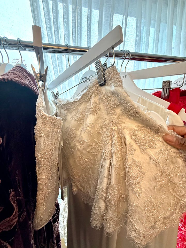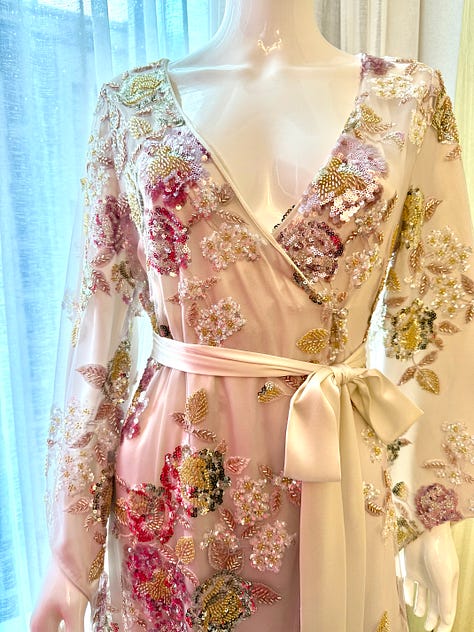 Rogers is a graduate of Fashion History from Central Saint Martins, and through her brand takes the cultural significance of the undergarments in the 1800s and classifies them as ready-to-wear in 2025. While she used to live in England, she has moved the brand to New York City to work with ateliers, importing the laces she uses from Italy and France. This global approach to the brand is due to her keen attention to detailing. For example, the bride collection she has available is handmade in Paris and in one example, the intricate detailing took 29 hours to make, she said. Additionally, the Floral Affair Robe ($7,029 CAD) has hand sewn organzas to create dimension.